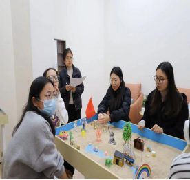 在考研减压团体心理沙盘活动中,主持人对大家放入沙盘中的沙具所产生的心理进行一一讲解,对同学们做出适当的指导并给予放松心态的建议。随后,主持人引导同学们进行沟通交流,一起分享交流沙盘活动的心得与收获。