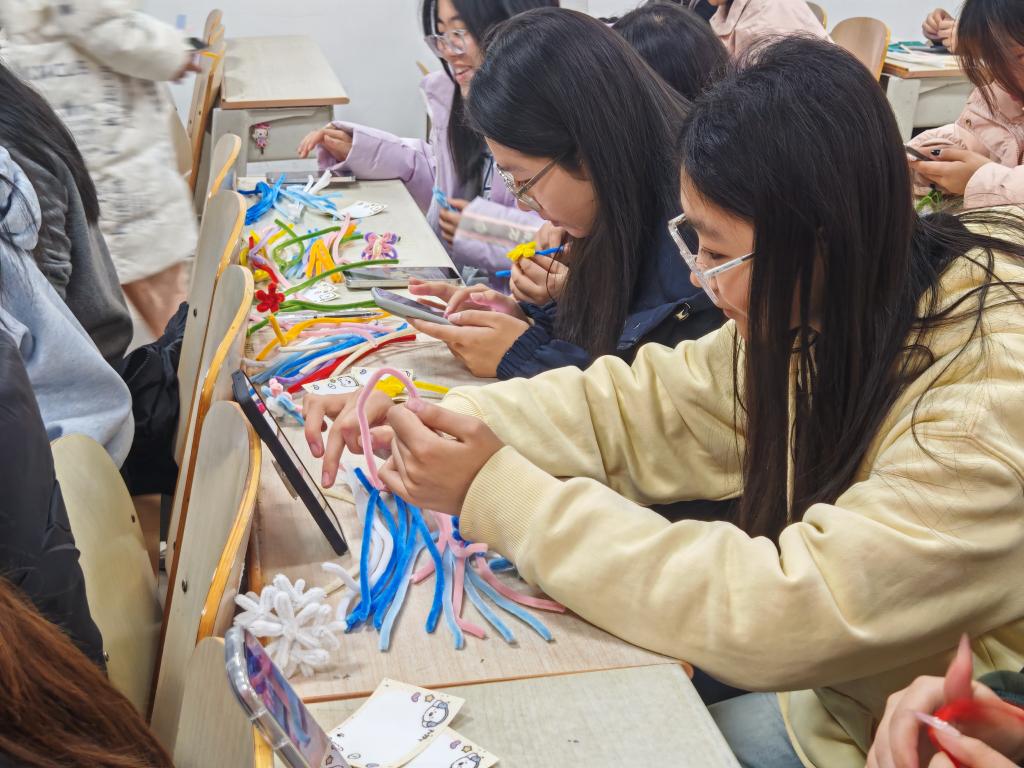 活动期间,学生们有序领取卡片、扭扭棒等手工材料,充分发挥想象力,运用剪、绕、粘等方法将扭扭棒制作成各具特色的冬日主题手工作品。同时,大家围绕小雪节气的民俗内涵与冬季养生知识进行交流,分享各自的养生小窍门,在动手实践与互动探讨中,深入了解顺应时节的健康生活方式,增强养生意识。