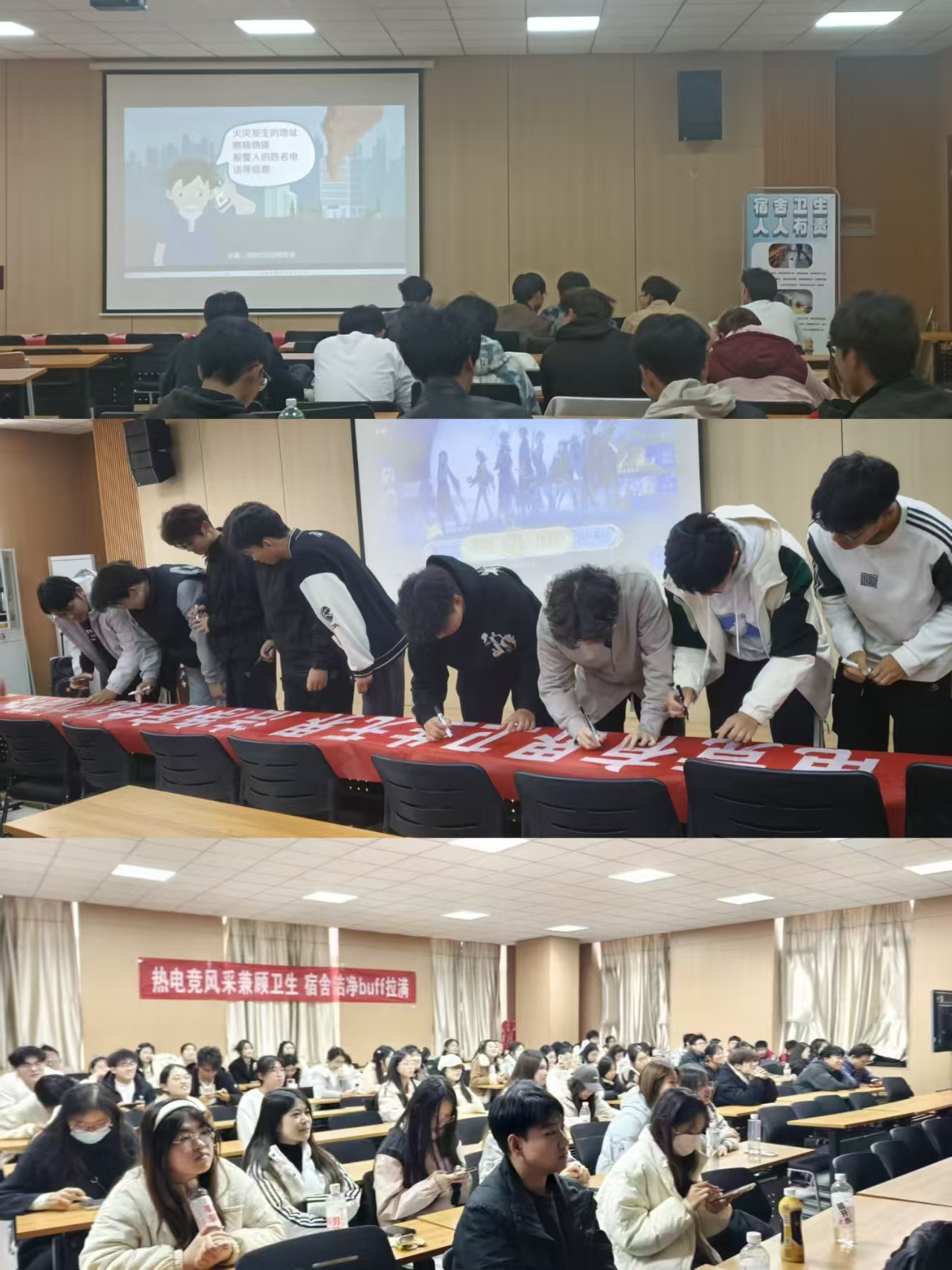 赛道一为线上宿舍安全标语设计大赛。同学们以宿舍安全、内务整洁为主题,融入游戏元素,踊跃创作,设计出诸如“防御塔坚不可摧,宿舍安全不容懈怠”等作品,进一步加深了同学们对宿舍安全规章制度的认知。赛道二为线下电竞比拼大赛。赛前每支参赛战队需完成常态化宿舍卫生打卡,只有卫生安全达标的宿舍,队伍才能获得参赛资格,有效督促了同学们共同打理宿舍家园。比赛现场,参赛选手默契协作,沉着应战每一轮对决,以全力以赴的劲头彰显青春担当。此外,赛场休息时段循环播放宿舍安全卫生宣传短片,向在场同学普及安全用电、消防常识及卫生整理技巧,让大家在感受竞技热忱的同时,潜移默化掌握安全卫生知识。