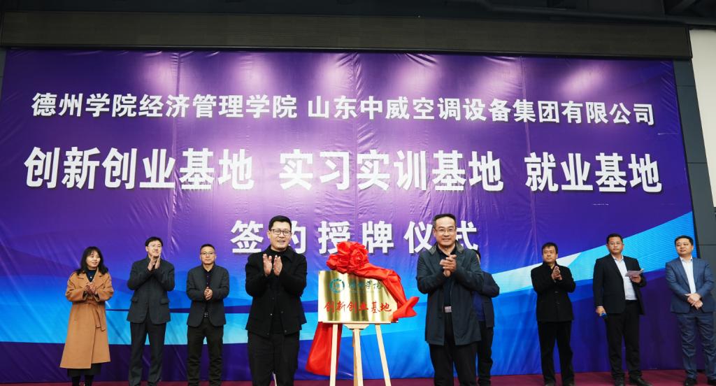 为贯彻落实学校应用型转型工作部署,推进经济管理学院应用型转型发展和应用型人才培养改革,学院积极推动校地校企深度合作,主动对接行业企业,拓宽产教融合、学生就业、创新创业渠道,助力学院内涵式高质量发展。3月24日下午,学院一行9人,赴德州市武城县与山东中威空调设备集团有限公司进行签约授牌仪式。武城县政协副主席、暖通空调产业链党委第一书记沙汉斌,山东中威空调设备集团有限公司董事长张传义等参加了签约仪式。