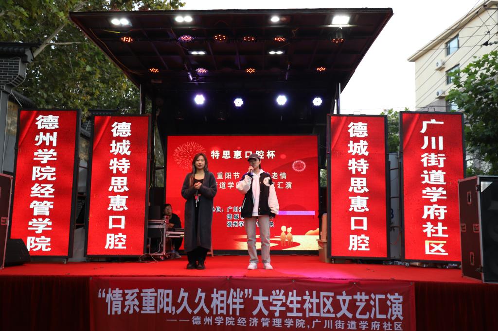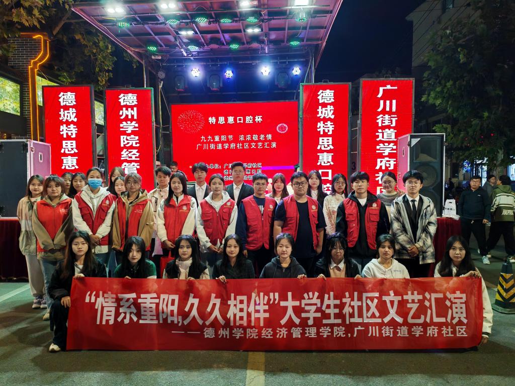 在重阳节到来之际,为丰富社区群众的精神文化生活,营造尊老、爱老、助老的良好氛围,组织好“百万大学生进社区”实践活动,扎实开展好大学生社区实践计划。10月19日,经济管理学院联合广川街道学府社区开展“情系重阳,久久相伴”社区文艺汇演活动。