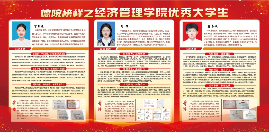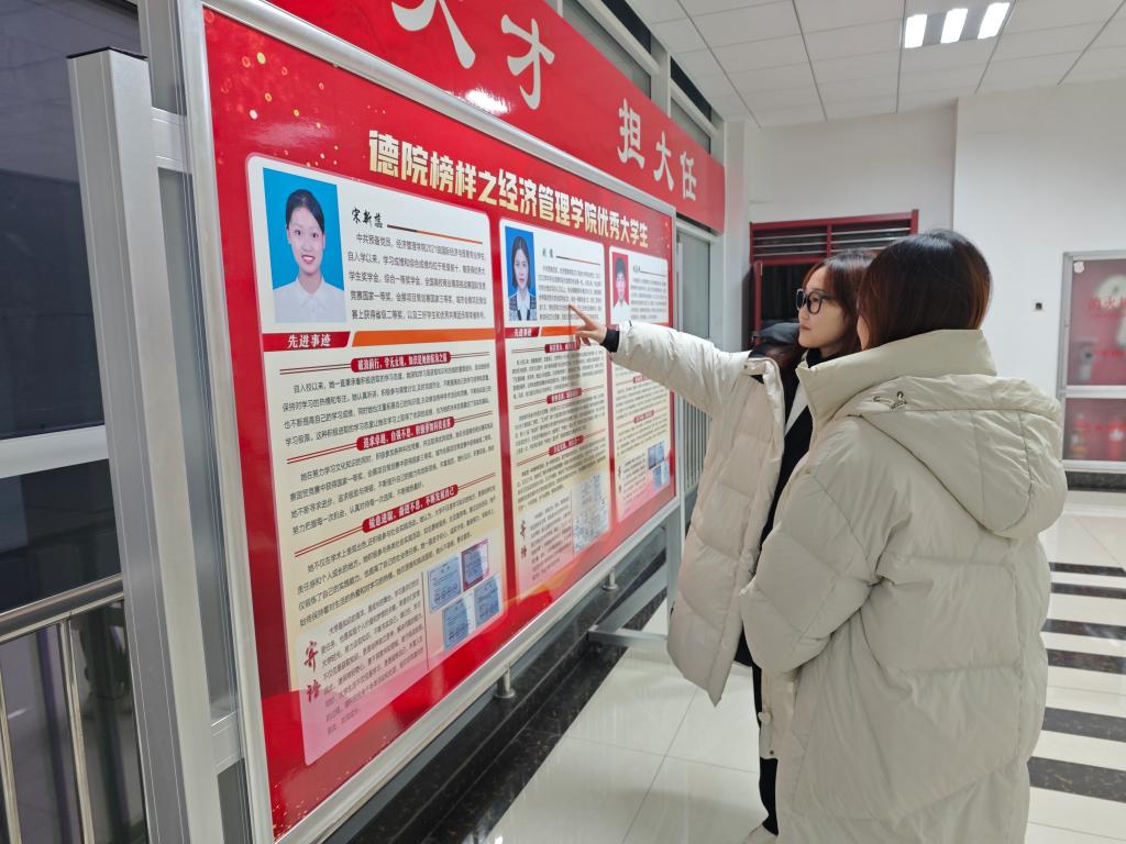 学院制作了“德院榜样之了不起的国奖生”“德院榜样之了不起的省奖生”“德院榜样之经济管理学院优秀大学生”学风建设优秀学子风采展板进行宣传展示,通过宣传2022-2023学年国家奖学金、省政府奖学金、优秀大学生奖学金、“经管榜样·十佳之星”获得者先进事迹,号召同学们与先进为伴,与榜样同行。经管学子纷纷表示要向榜样学习,寻找自身差距,成就更好更优秀的自己,同时也为集体增添荣光。