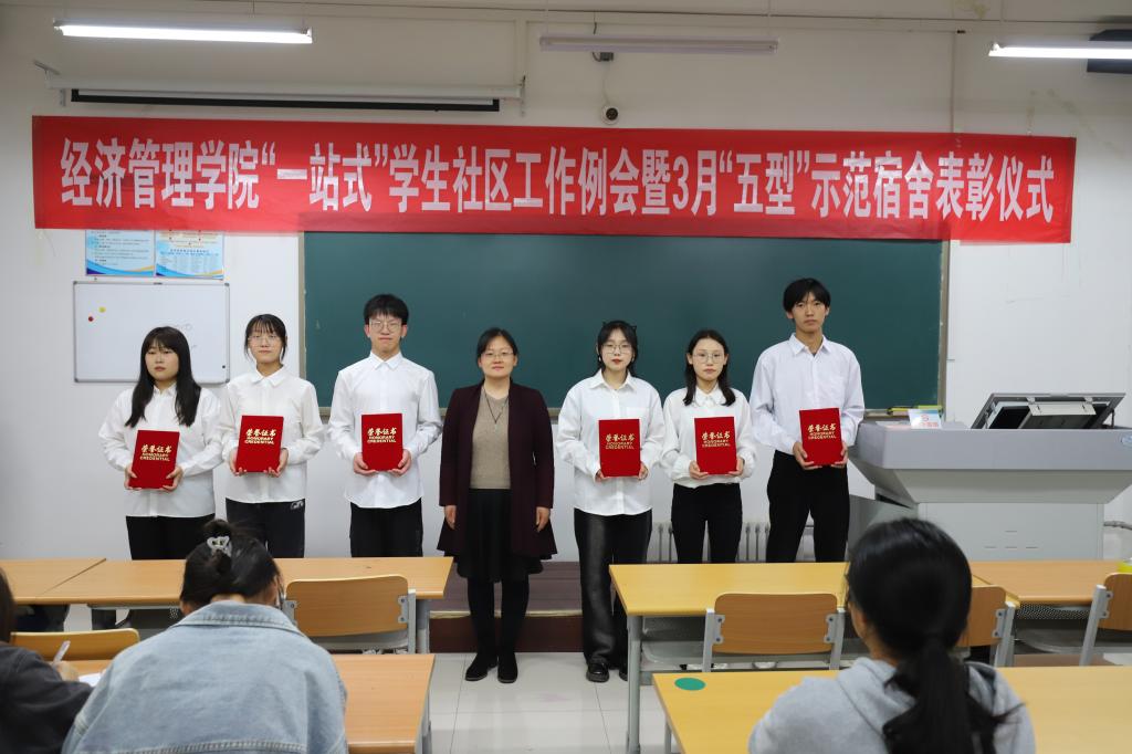 经济管理学院“五型”示范宿舍评选活动,是在德智体美劳五个方面均衡发展、全面提升的基础上,分别围绕“德”育功能创建思想引领、崇尚品德的“服务先锋宿舍”;围绕“智”育功能,创建学风良好、成绩优异的“学业示范宿舍”;围绕“体”育功能,创建热爱锻炼、崇尚健康的“文体标兵宿舍”;围绕“美”育功能,创建环境优美、布置独特的“环保创新宿舍”;围绕“劳”育功能,创建勤劳善动、争优创先的“劳动模范宿舍”等方面开展。表彰仪式上,宣读了《经济管理学院关于给予2023年3月一站式学生社区“五型”示范宿舍表扬的通知》,为获奖宿舍颁发荣誉证书,同时部署经济管理学院学生社区服务中心下一步重点工作。