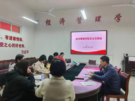 为持续强化人才培养的中心地位,规范教学过程管理,全面了解学院本学期的教学运行情况,不断提高人才培养质量,11月14日下午,经济管理学院召开系主任例会暨期中教学检查工作推进会,安排部署期中教学检查工作。学院相关负责人和全体系主任参加了会议。