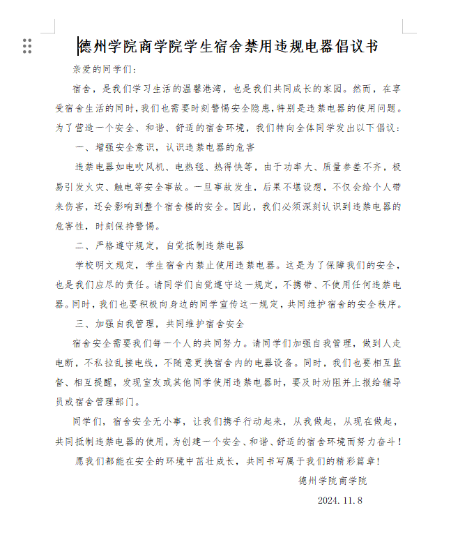 《taptap点点体育学生宿舍禁用违规电器倡议书》从三方面强调宿舍安全,号召学生不仅要充分认识使用违规电器的危害,更要自觉抵制违规电器。最后,倡议书强调广大同学不仅要加强自我管理,还要勇于监督、提醒身边的同学,共同维护宿舍安全。