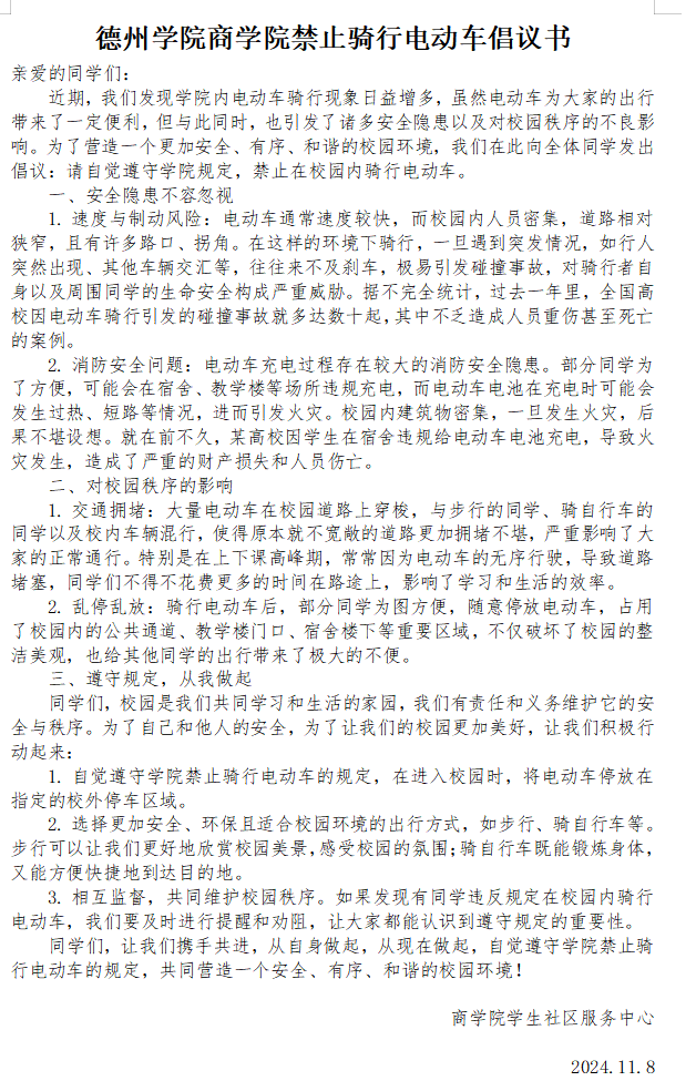 为营造一个更加安全、有序、和谐的校园环境,减少在学院内骑行电动车、宿舍内违规使用电器等行为所带来的安全隐患,以及这些行为对校园秩序造成的不良影响。taptap点点体育特发布《taptap点点体育禁止骑行电动车倡议书》与《taptap点点体育学生宿舍禁用违规电器倡议书》。