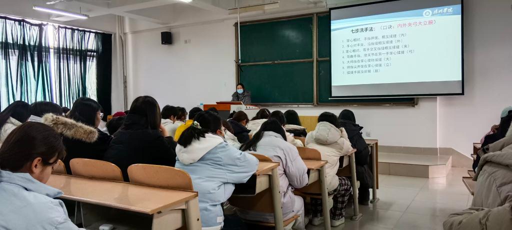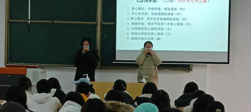 邓燕老师结合冬季传染病高发特点,围绕“冬季防护重要性、流感与诺如病毒解析、科学预防方法、实操演练、互动答疑”五大板块展开详细讲解。同时,在现场演示了口罩正确佩戴步骤与“内外夹弓大立腕”七步洗手法,针对诺如病毒呕吐物应急处理流程进行了实操教学,指导师生做好个人防护与环境消毒。会后,同学们围绕“流感疫苗接种后仍感染的原因”“诺如病毒感染后如何护理”等问题积极提问。