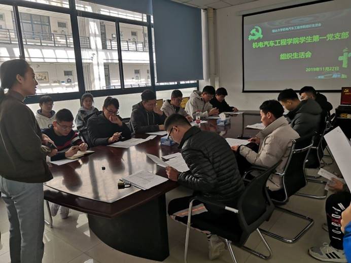本次组织生活会分为四部分展开进行,即观看主题教育宣传片、学期支部工作述职报告、党员开展批评与自我批评、先锋示范岗设岗动员。会议伊始,各党支部主持人对本次会议做出会议发言,说明组织生活会的目的和流程。随后,全体党员观看“不忘初心、牢记使命”主题教育宣传片,各位同志认真观看影片并做好学习记录。紧接着,党支部进行本学期支部工作述职报告,与会党员对党支部的工作作出评价,并对现阶段学院或者支部工作情况提出存在的问题以及整改措施。研究生党支部成员张文涛说道:“完成党支部的工作是一件负有责任的神圣任务,党支部成员应该在实践中掌握本领,在服务同学的同时丰富自己的经验”。之后,党员进行自我批评并由其他党支部成员提出意见,党支部成员认真聆听,听取意见。随后,由申请党员先锋示范岗的优秀党员发表党员先锋示范岗的工作心得与体会,对新党员进行设岗动员。至此,本次组织生活会圆满结束。