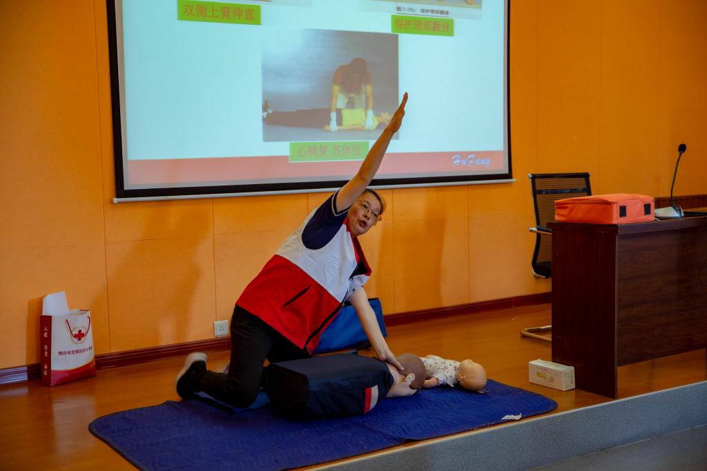 胡芳首先从红十字文化开始讲解,同时通过视频的方式向在场师生展示了真实案例,通过最直观的方式提高同学们的重视程度。在应急救护培训环节,她用通俗易懂的语言,结合真实案例和模拟人现场演示,采用理论知识讲解和实际操作相结合的方式,详细讲解了心肺复苏术、AED急救设备的使用和海姆立克急救法三项内容。在讲解过程中,胡芳强调,急救最关键的一点就是急救方式的正确使用,尤其是要注意婴儿急救与成人急救方式上的不同。