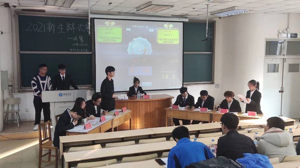 本次比赛分为上、下半区共四场辩论赛。辩题紧贴时代热点和社会现象,积极引导新生树立正确的价值观,辨析生活之理。比赛伊始,赛事主席为参赛选手介绍比赛规则,随即比赛正式开始。在上半区的赛场上,正方以“当前中国人更应该培养民族自豪感”为论点,旁征博引、步步紧逼,反方以“当前中国人更应该培养危机感”为论点,唇枪舌战、互不相让。无形的思想火花在双方辩手之间迸发。在质询环节,辩手们针对立论中出现的问题进行辩驳探讨,交互轮转间拓展了思维维度,唇枪舌战中尽展少年思辩智慧。在场观众屏息凝气,认真聆听,屡屡报以热烈的掌声。思维与灵魂的碰撞,无限缩短了我们与真理的距离。在下半区的自由辩论环节,辩手们畅谈时事,针砭时弊,结合多重论证方法就“各国应不应该全面禁烟”这一论题阐述自己的见解,并针对对方的逻辑缺漏提出质疑反驳。双方滔滔不绝,妙语连连,或激情澎湃或娓娓道来,将现场气氛推向高潮。热烈的比赛氛围、熟练的理论运用及良好的辩风感染了在场的每一位观众。比赛在四辩的总结陈词中落下帷幕。随后,评委们充分肯定了参赛辩手充分的赛前准备和卓越的赛场呈现,并提出了相应指导性建议。最后,经过评审小组的严格打分,机213-2班辩论队在四支队伍中脱颖而出,夺得桂冠。机216-2班辩论队夺得亚军,机213-3班辩论队夺得季军。其中机211-2的任宝贞和机213-2李柏林被评为最佳辩手。