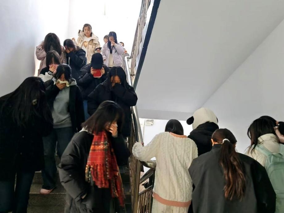 一阵急促哨声响起!消防应急疏散演练活动正式开启。同学们用湿毛巾捂住口鼻迅速行动起来,她们快速而有序地按照预定疏散路线进行撤离。在撤离过程中,展现出了良好的应急反应能力。参加演练的全体师生在极短的时间内便集中到18号楼门前,组织人员也第一时间进行人数清点,并及时汇报参演情况,整个演练过程高效且有序。