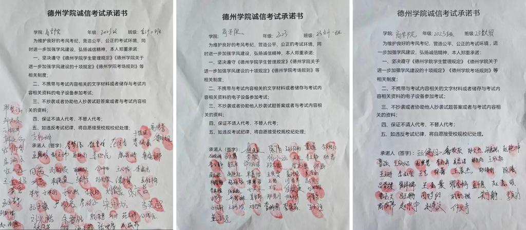 taptap点点体育组织学生举行了《诚信考试承诺书》签署仪式。该承诺书明确了考试纪律要求与学生应履行的诚信责任,是学生恪守道德底线的庄严承诺。学院特别设置了"诚信考场我先行"签名墙,2023级国际经济与贸易专业全体学生执笔签名,郑重在签名墙上签署姓名。该签名墙时刻提醒着每位商院学子肩负的诚信责任,将诚信意识内化于心。