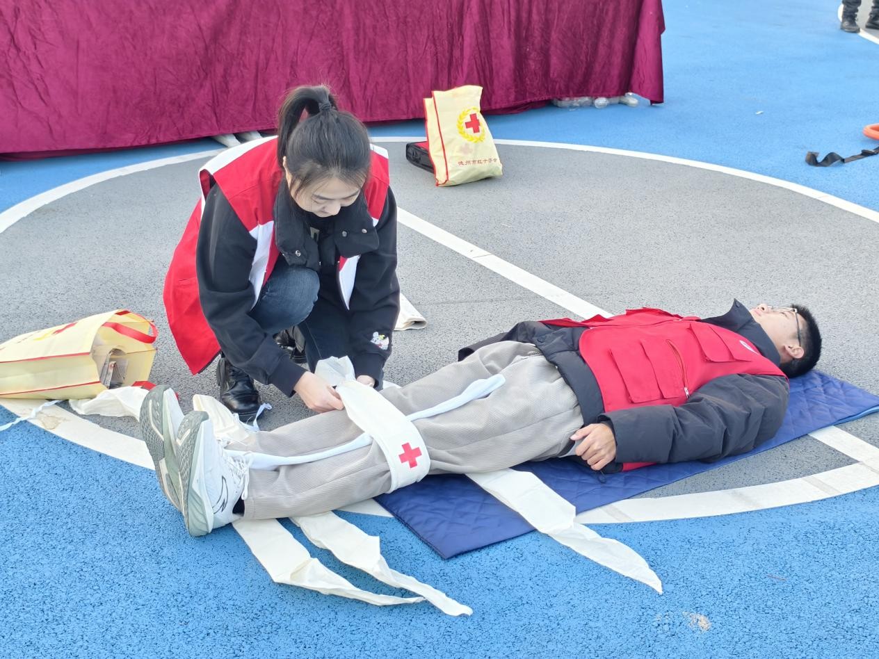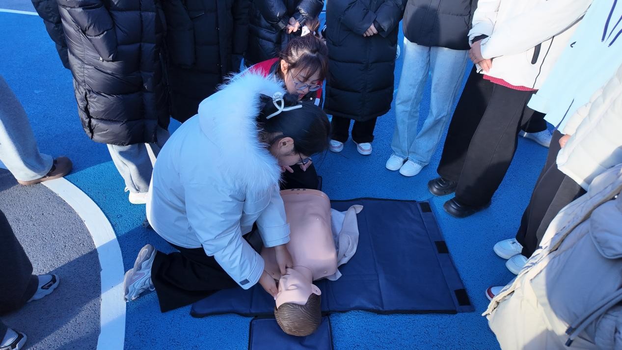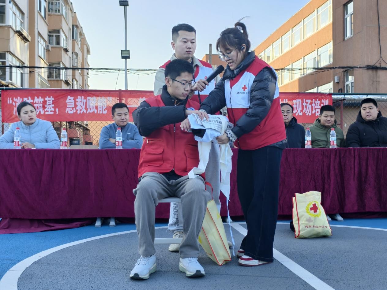 三是实操培训抓规范,急救技能强保障。活动特邀德州市红十字会应急救护培训中心国家级应急救护培训师、德州市蓝天救援队队长杨岸瑛老师主讲,开展“消防・应急急救”专项培训,重点聚焦心肺复苏(CPR)、烫伤应急处理、骨折包扎固定、伤员安全运输等急救技能教学。参训学生分组进行实操训练,德州市红十字会工作人员全程指导,逐一纠正不规范动作,确保参训学生均能掌握实操要领。此次专项培训有效提升了师生应急急救实操水平,为校园安全增添重要保障。