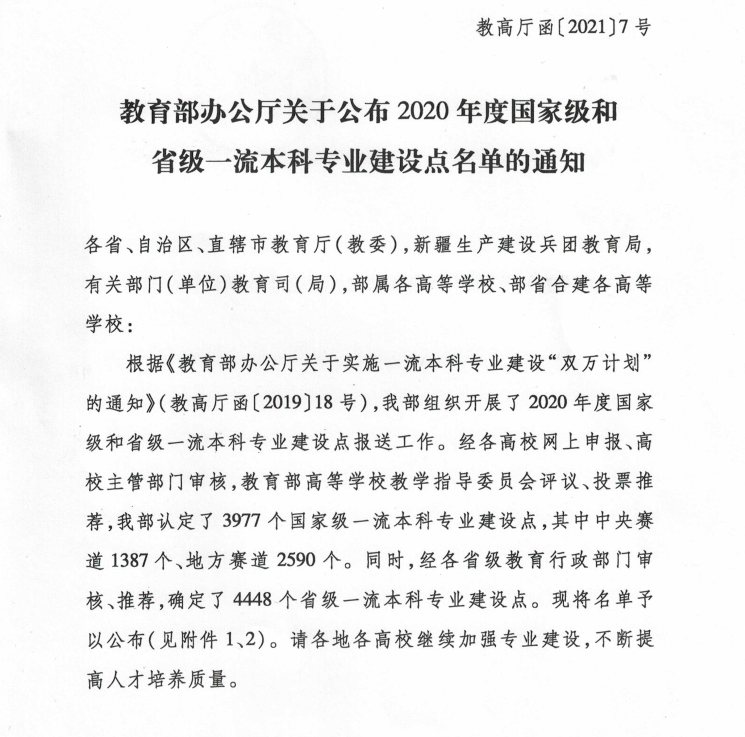 近日,教育部办公厅公布2020年度国家级和省级一流本科专业建设点名单(教高厅函〔2021〕7号),浦京官网机械设计制造及其自动化专业入选2020年度国家级一流本科专业建设点!!!